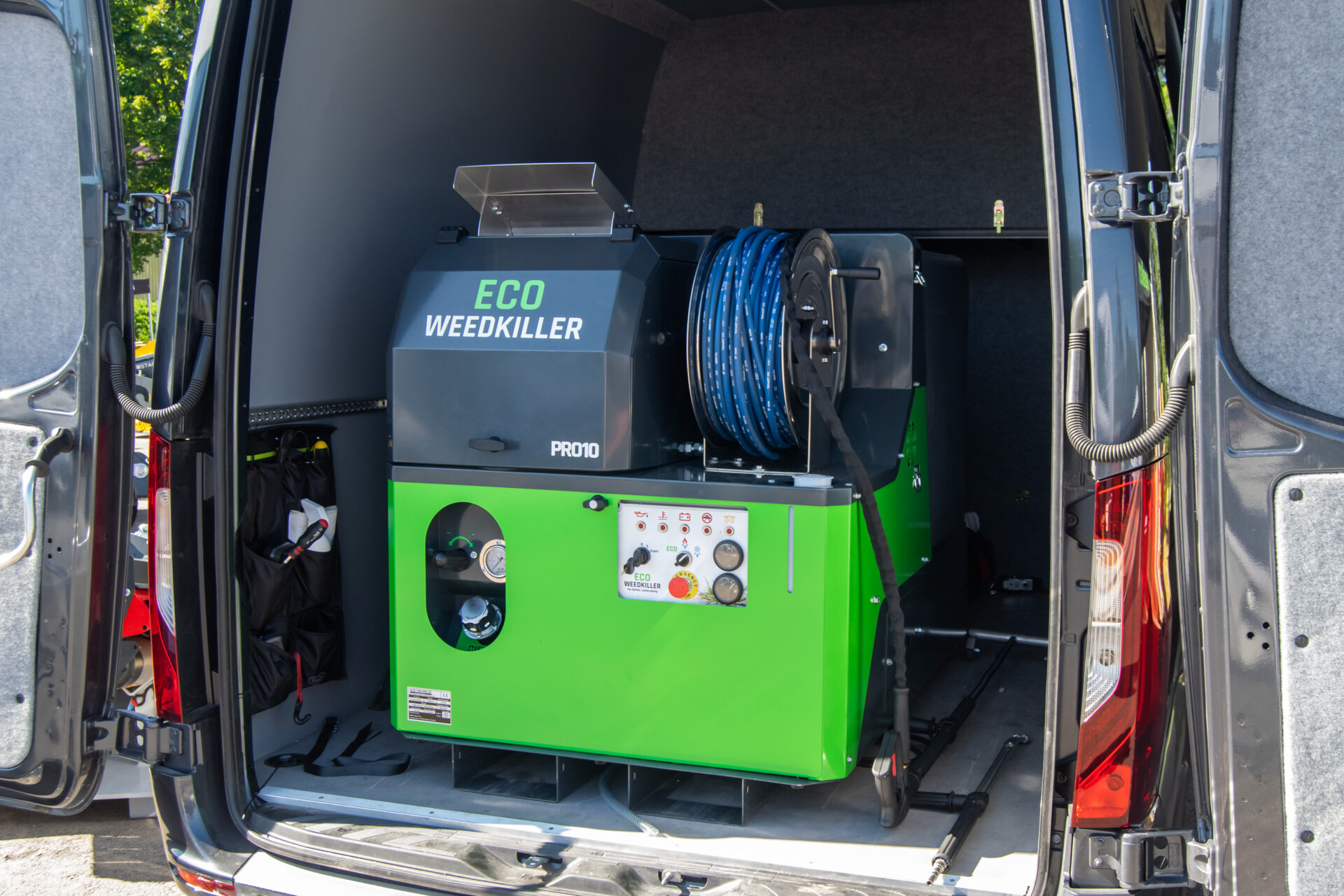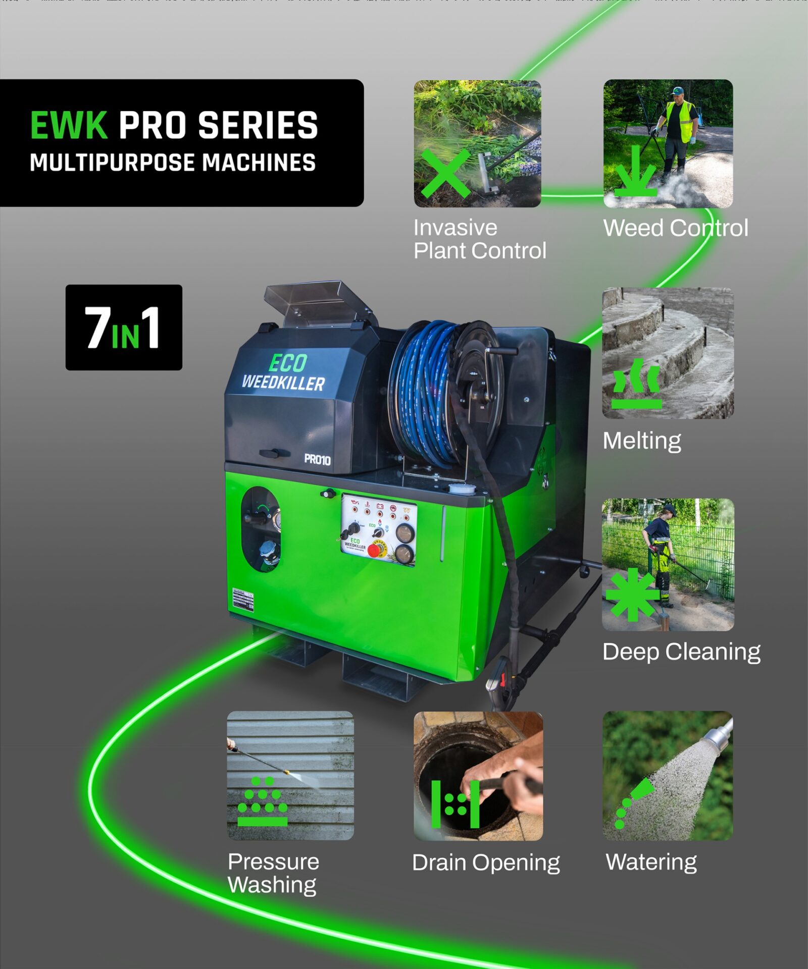 Multifunctional hot water unit for property and environmental maintenance. Its versatility ensures year-round use, with weed and invasive species control as the starting point in the product development. The unit is also perfectly suited for a wide range of cleaning, drain opening and melting tasks. An optional electrolysis unit for producing ozone water opens a completely new level of deep cleaning — for example playgrounds, shopping carts, etc. — and all without chemicals; it’s just water. Not forgetting the possibility to use the unit for watering. A true multi-talent for environmental maintenance.