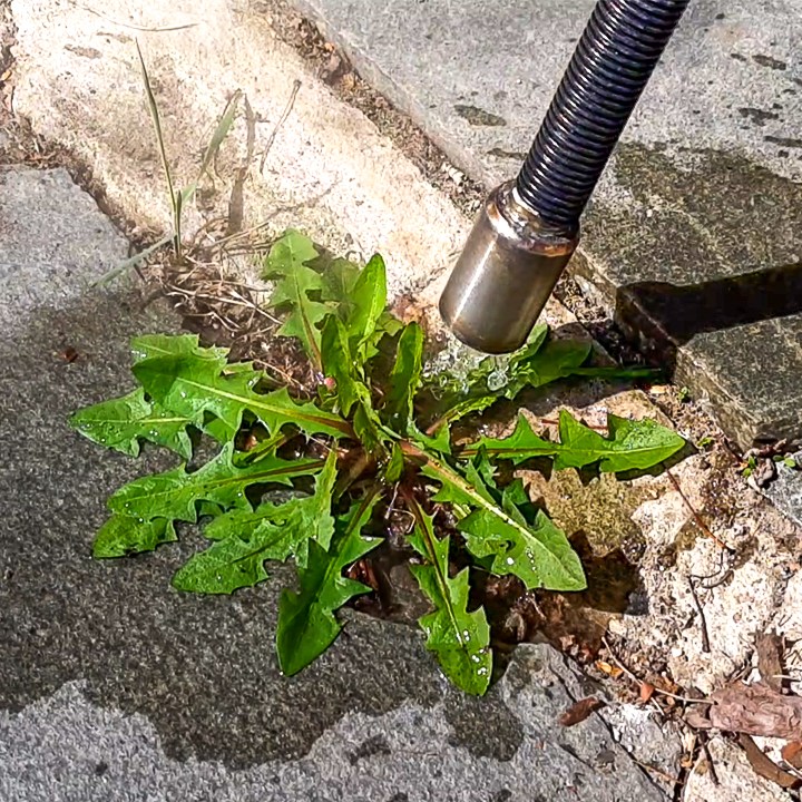 - The hissing sound from the nozzle indicates that the water is at 100°C during weed control.