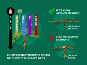 Thanks to the technology used in Eco Weedkiller systems, hot water is effectively absorbed into the ground, transferred to the root system, and destroys the plant’s cellular structure. As a result, the weed dies down to the roots, and regrowth is significantly reduced.