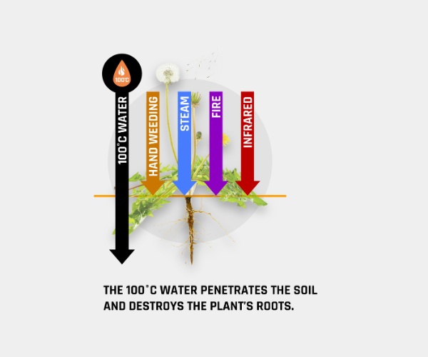 Thanks to the technology used in Eco Weedkiller devices, hot water is effectively absorbed into the ground, transferred to the root system, and destroys the plant’s cellular structure. As a result, the weed dies down to the roots, and regrowth is significantly reduced.