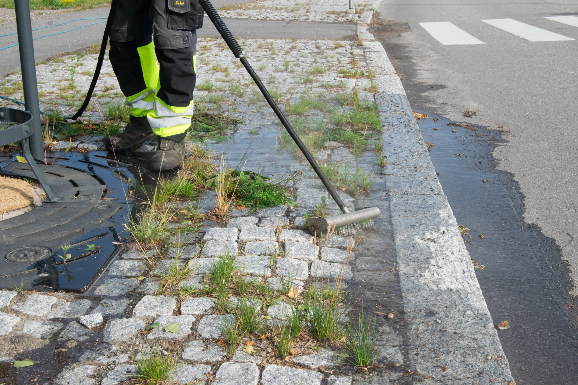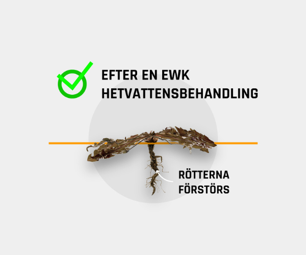 Tack vare Eco Weedkiller-maskinernas teknologi hålls vattnet kokhett ända tills det når roten och förstör den. Våra maskiner levererar alltid 100-gradigt vatten på områden täckta av ogräs eller invasiva arter. Dropparna är stora, vilket gör att tillräckligt med värmeenergi lagras i vattnet för att effektivt förstöra rötterna. Mängden vatten kan justeras för att bestämma hur djupt värmen tränger ner. Vanligtvis uppnås goda resultat med 3–5 liter vatten per kvadratmeter. Djupt rotade ogräs, vedartade växter eller invasiva arter kräver mer vatten.