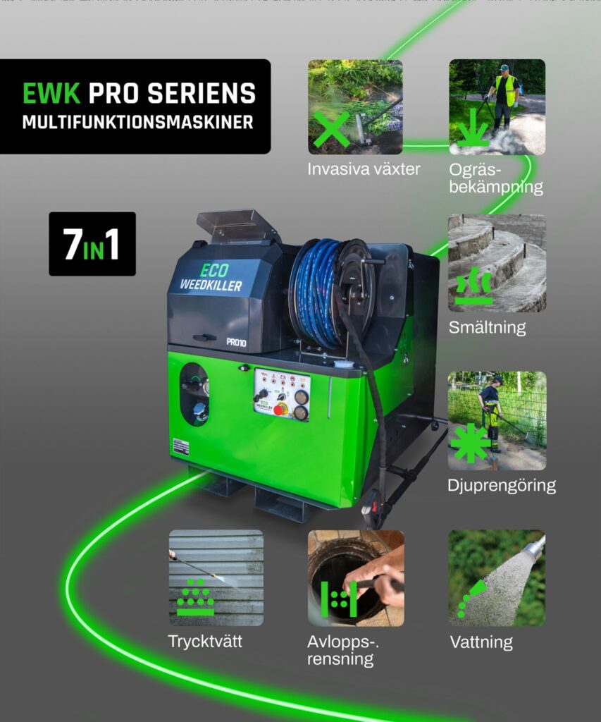 Genom att kombinera sju funktioner i en och samma maskin erbjuder Eco Weedkiller Pro-serien hög nyttjandegrad året runt, minskar behovet av separata maskiner, ger kostnadsbesparingar och möjliggör ett miljövänligt arbetssätt.